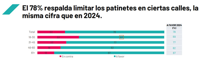 Del mismo modo, el auge de la micromovilidad conlleva una respuesta ciudadana en términos de percepción del uso y seguridad. En esta línea, el 78% de los españoles apoya limitar la circulación de los patinetes en determinadas calles, con un porcentaje casi idéntico al de 2024, lo cual confirma un consenso estable en cuanto a la necesidad de regular la circulación de este tipo de vehículos.