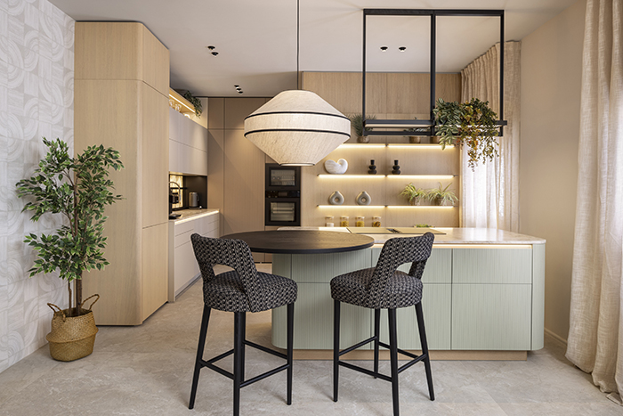Por otra parte, el espacio Leicht propone una cocina que se funde con la arquitectura del hogar, creando un entorno continuo, equilibrado y silencioso. Está inspirado en la estética hygge, y presenta materiales naturales, tonos suaves y una composición que transmite calma y bienestar.